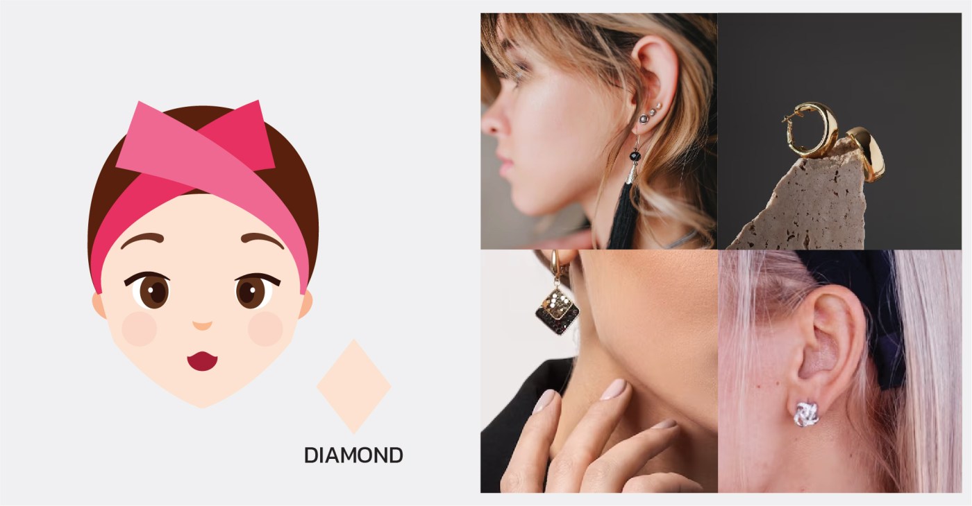 5. ใบหน้ารูปเพชร (Diamond) : ใบหน้ารูปเพชรมีลักษณะที่ละเอียดอ่อนและแคบ เพื่อให้มุมของคุณดูดียิ่งขึ้น ลองสวมต่างหูแบบติดหู ห่วงเล็กๆ หรือต่างหูทรงหยดน้ำที่มีความโค้งมน หลีกเลี่ยงต่างหูที่ยาวเกินไป เพราะจะทำให้ใบหน้าดูแคบลงได้