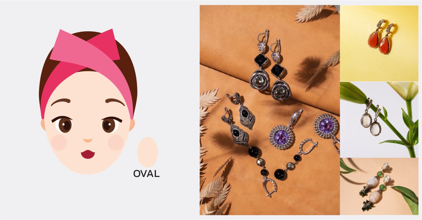 2. ใบหน้ารูปไข่ (Oval) : โชคดีสำหรับคุณ รูปแบบต่างหูส่วนใหญ่เข้ากันได้ดีกับใบหน้ารูปไข่ อย่างไรก็ตาม